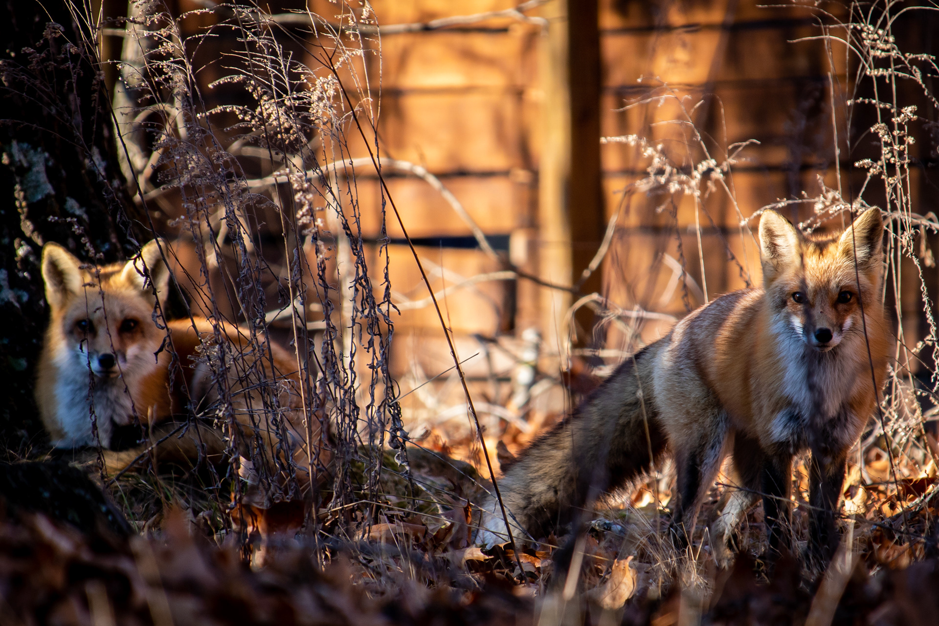 I took this image of two red foxs in Bella Vista, Arkansas, in my backyard in January of 2023.